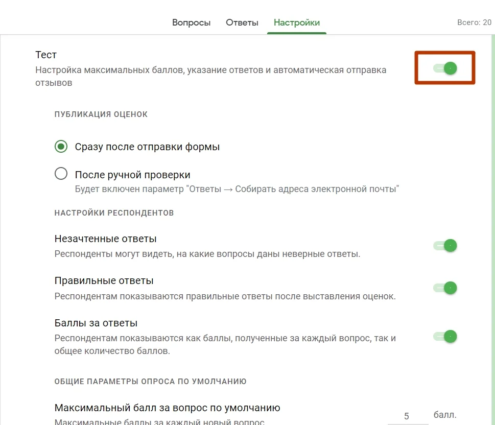 Подсчет баллов. Если вы хотите использовать форму для проверки знаний, вам нужно превратить ее в тест. Для этого зайдите в «Настройки» и включите опцию «Тест».