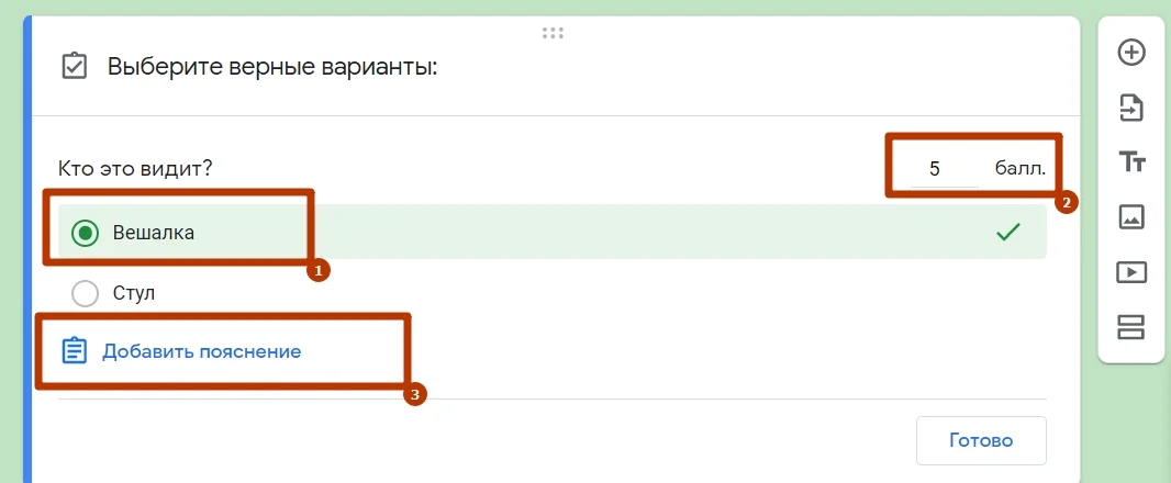 После того, как вы включите режим теста, в каждом вопросе можно будет указывать правильный ответ, количество баллов за него и добавлять пояснения.