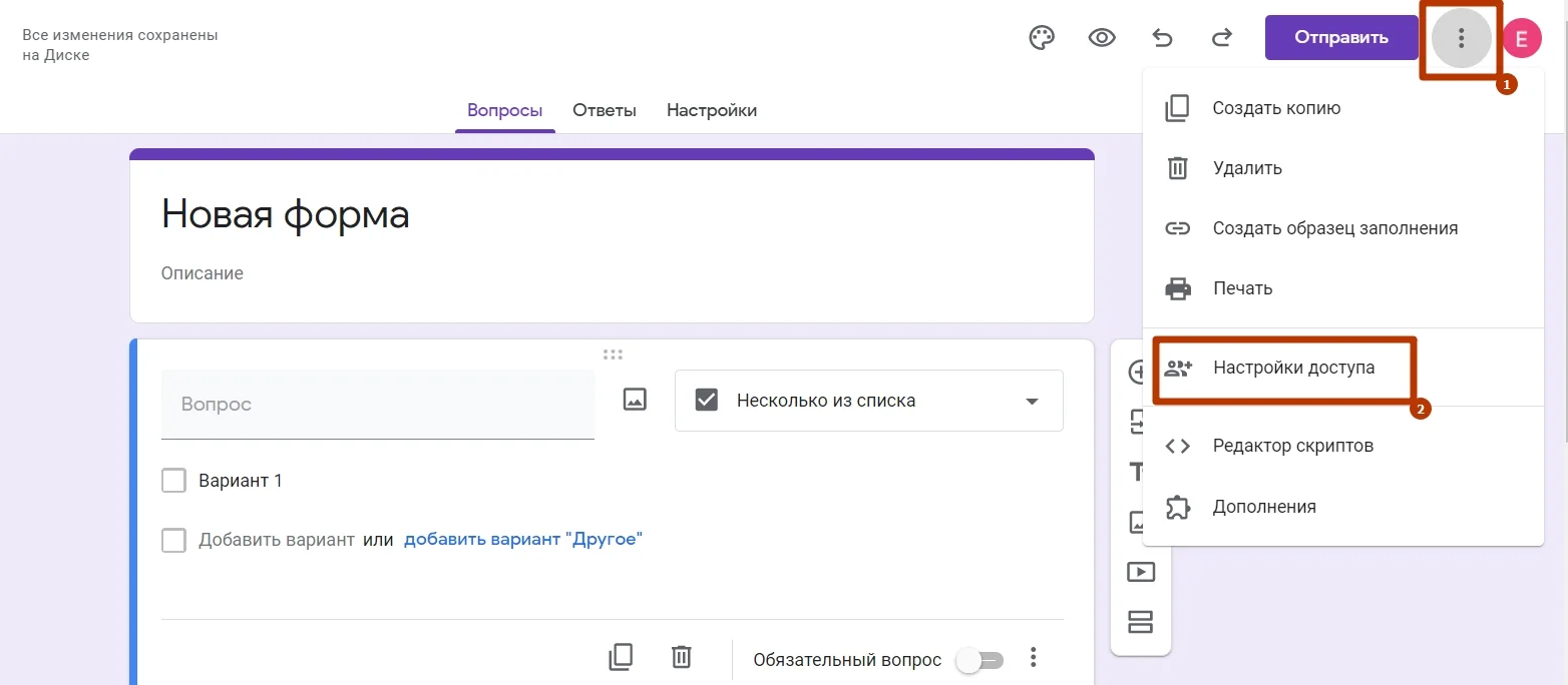 Совместный доступ к форме. Зайдите в меню (три точки) и выберите «Настройка доступа».