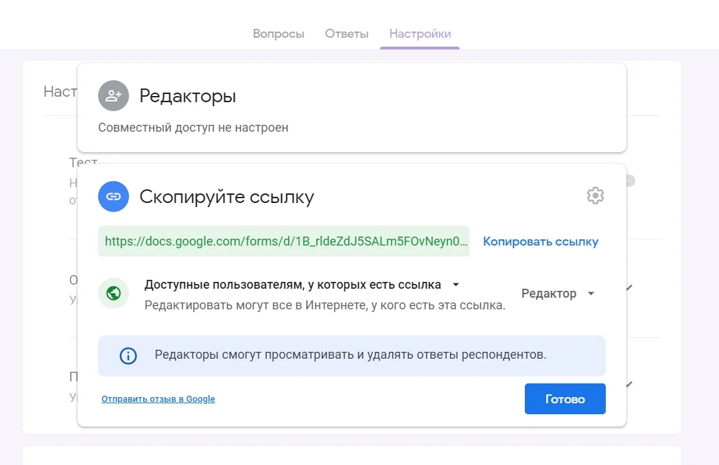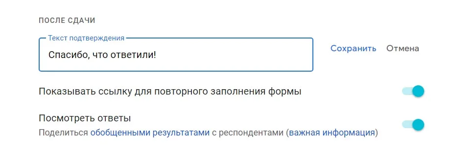 Здесь же можно выбрать, увидят ли респонденты ссылку для повторного заполнения формы и ответы других пользователей.