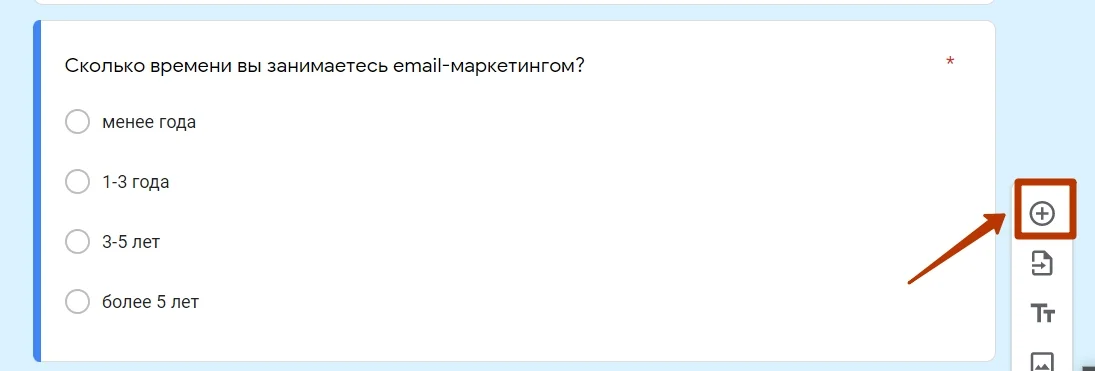 Ключевой элемент формы — вопросы. Чтобы добавить вопрос, нажмите на кнопку на панели инструментов.