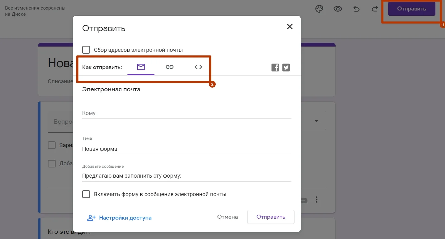 Созданную форму можно отправить в письме на определенный email, скинуть ссылкой и даже добавить на сайт с помощью сгенерированного куска HTML-кода.