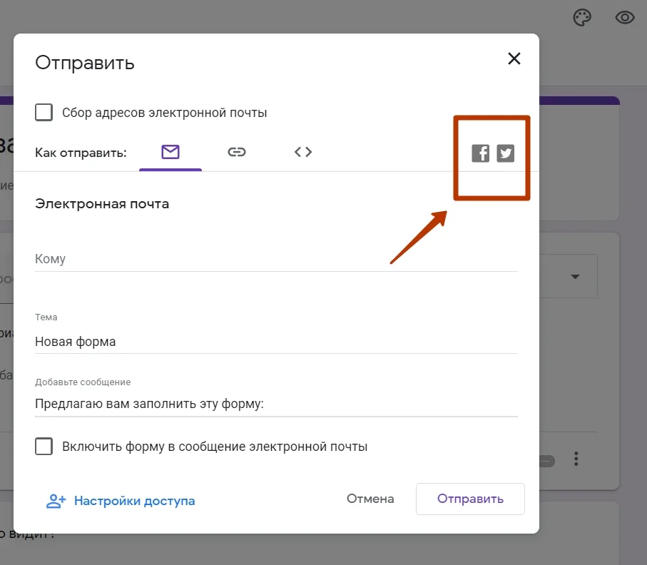 Кроме того, форму можно быстро опубликовать в Facebook* или Twitter. Для этого кликните на нужную иконку.