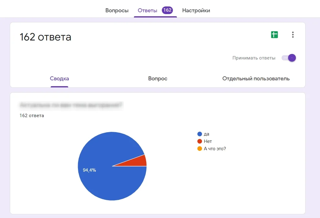 Наличие статистики. Сервис позволяет анализировать ответы как по отдельным вопросам, так и по отдельным респондентам. Для более развернутого анализа и построения графиков можно за пару кликов экспортировать данные в Google Таблицы.