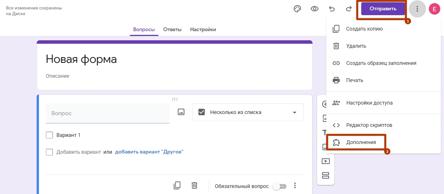 Чтобы увеличить функционал Google Forms, можно установить специальные надстройки. Для этого зайдите в меню и выберите «Дополнения».