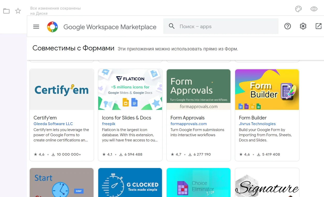 Откроется окно со списком приложений, которые совместимы с Формами. Выберите подходящий вариант и кликните на «Установить».