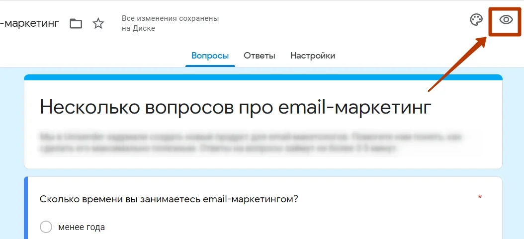 Если хотите протестировать готовую форму, нажмите на глаз, чтобы открыть режим предпросмотра.