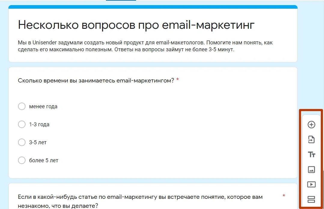 Откроется конструктор, в котором можно собрать форму с помощью панели инструментов справа. В форму можно добавить вопрос, картинку, видео из YouTube, описание или новый раздел. Кроме того, есть возможность импортировать вопросы из другой формы, чтобы не создавать их заново.