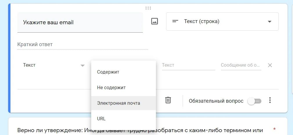 Текст (строка) и текст (абзац). Используется для вопросов, ответы на которые нужно сформулировать самостоятельно: например, написать имя, почту или высказать свое мнение. При этом можно настроить проверку корректности ответов, нажав на три точки в правом нижнем углу блока с вопросом. В настройках можно указать минимальную или максимальную длину сообщения и даже проверить правильность ввода электронной почты.