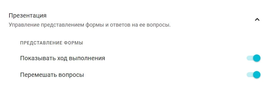 Режим презентации. В форму можно добавить немного интерактива и показывать ход прохождения опроса. Также можно сделать так, чтобы каждому респонденту вопросы показывались в случайном порядке.
