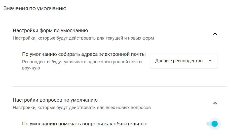 Значения по умолчанию. Если ваша компания часто делает опросы или тесты, вы можете добавить 2 значения по умолчанию: сбор адресов и пометка всех вопросов как обязательных. Сделать шаблоны для внешнего вида формы, к сожалению, нельзя.