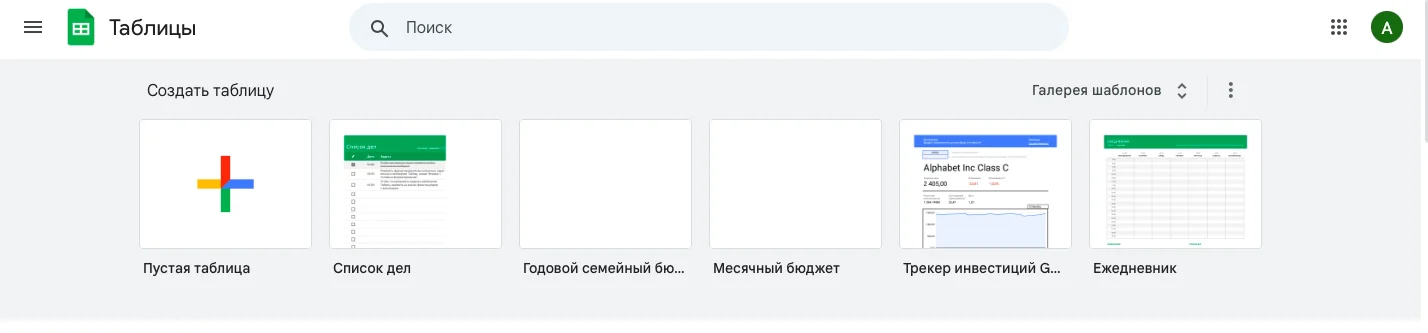 Таблицы можно создавать с нуля или использовать готовые шаблоны, представленные на главной странице редактора. Здесь же вы найдете и таблицы, с которыми работали ранее.