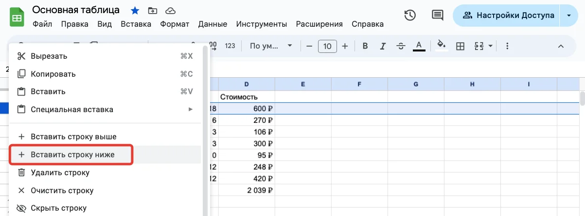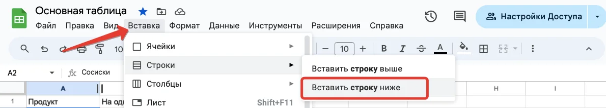 Под названием располагается главное меню со всеми операциями, которые можно делать с таблицами. Вот основные пункты меню, и что в них находится: