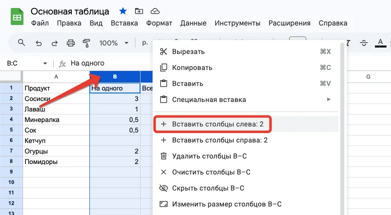 Аналогично добавляем столбцы. Выделяем столбец, рядом с которым нужно вставить новый, кликаем правой кнопкой мыши и в контекстном меню выбираем: «Вставить столбец слева/справа». С той же целью можно использовать главное меню: «Вставка» — «Столбцы» — «Вставить столбец слева/справа».