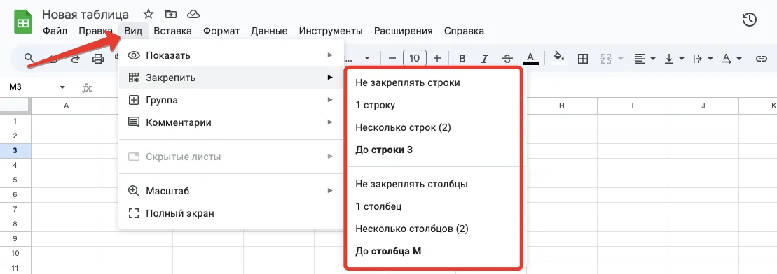 Сделать это можно через главное меню. Нажимаем на панели инструментов: «Вид» — «Закрепить». Затем выбираем, что именно не хотим потерять при прокручивании. Можно закрепить сразу несколько строк сверху и столбцов слева.