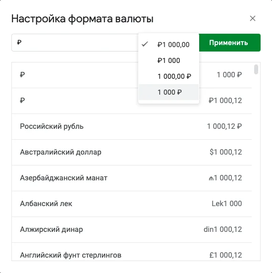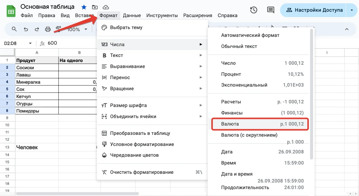 Для примера добавим в таблицу колонку со стоимостью продуктов и преобразуем эти числа в денежный формат — со знаком рубля, с округлением до рублей. Для этого выделим ячейки со стоимостью продуктов и в главном меню выберем: «Формат» — «Числа» — «Валюта». Откроется окошко настройки формата валюты. Выберем рубли и подходящий вариант отображения.