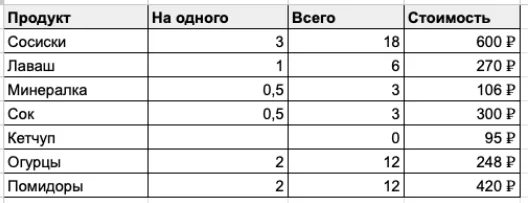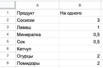 Чтобы сделать таблицу «с нуля», достаточно заполнить ячейки данными. Например, создадим таблицу с перечнем продуктов для пикника.