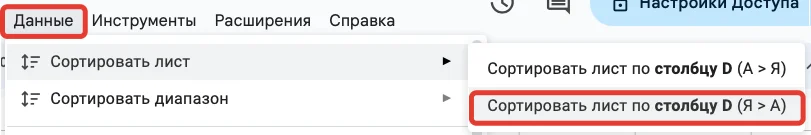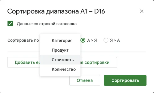 Выделяем столбец «Стоимость», по его данным будем сортировать таблицу. Выбираем в главном меню: «Данные» — «Сортировать лист» — «Сортировать лист по столбцу (Я > А)».