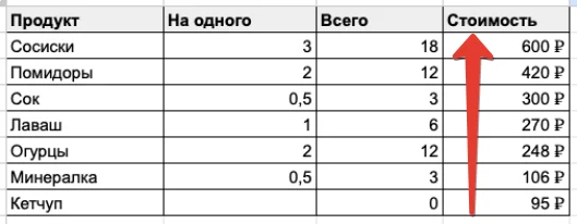 Например, отсортируем нашу таблицу со списком продуктов для пикника по стоимости продуктов — в порядке убывания, от дорогих к дешевым.