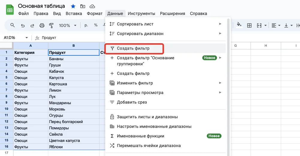 Допустим, у нас есть таблица со списком продуктов из двух категорий: фрукты и овощи, а нам нужно показать только овощи. Выделяем таблицу, в которой будем фильтровать данные. В главном меню нажимаем: «Данные» — «Создать фильтр» со значком воронки.