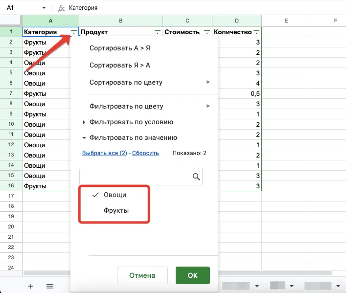 В примере мы работаем со столбцом «Категория». В меню фильтрации оставляем только «Овощи», а с других категорий убираем галочки. После этого в таблице будут показаны только овощи.