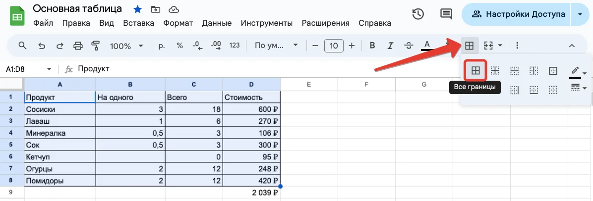 Иногда таблицы удобнее воспринимать, если у них есть чёткие границы. Особенно это важно при печати. Чтобы добавить границы, необходимо выделить таблицу и на панели инструментов выбрать «Границы» — «Все границы».