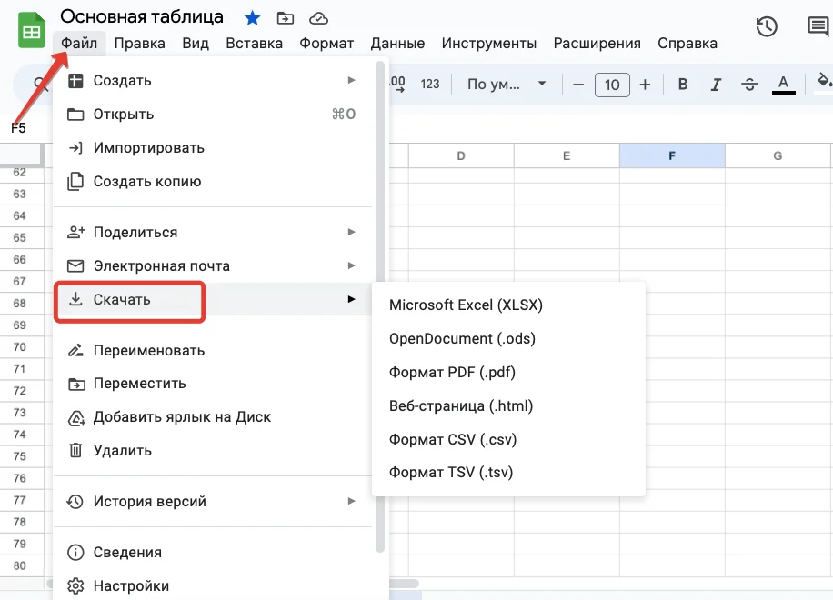 Чтобы скачать таблицу из онлайн-редактора на компьютер, в главном меню нужно выбрать: «Файл» — «Скачать» — и выбрать формат, в котором хотите получить данные.