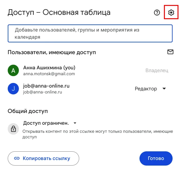 Также можно запретить скачивание таблицы для некоторых пользователей. Для этого в верхнем правом углу экрана нажмите кнопку: «Настройки доступа». Откроется окошко с настройками, в котором нужно нажать на значок шестерёнки.