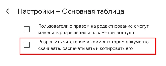 В появившемся окне уберите галочку со второго пункта «Разрешить читателям и комментаторам документа скачивать, распечатывать и копировать его». Щёлкните в любом месте экрана, чтобы вернуться в таблицу, настройки сохранятся.