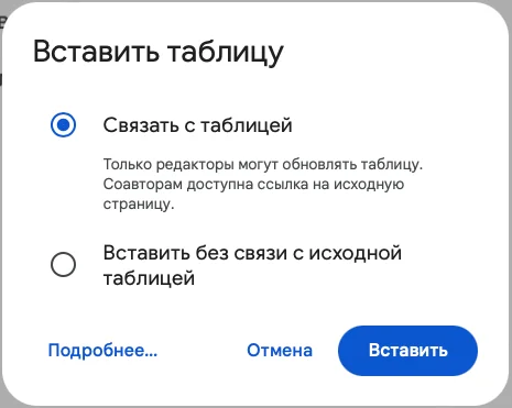 Если выберем пункт «Связать с таблицей», то при изменении данных в исходной таблице в Google Sheets они изменятся и в документе. Это удобно, если нужно часто обновлять информацию. Но есть ограничение: так можно вставить только таблицы, содержащие не больше 400 ячеек.