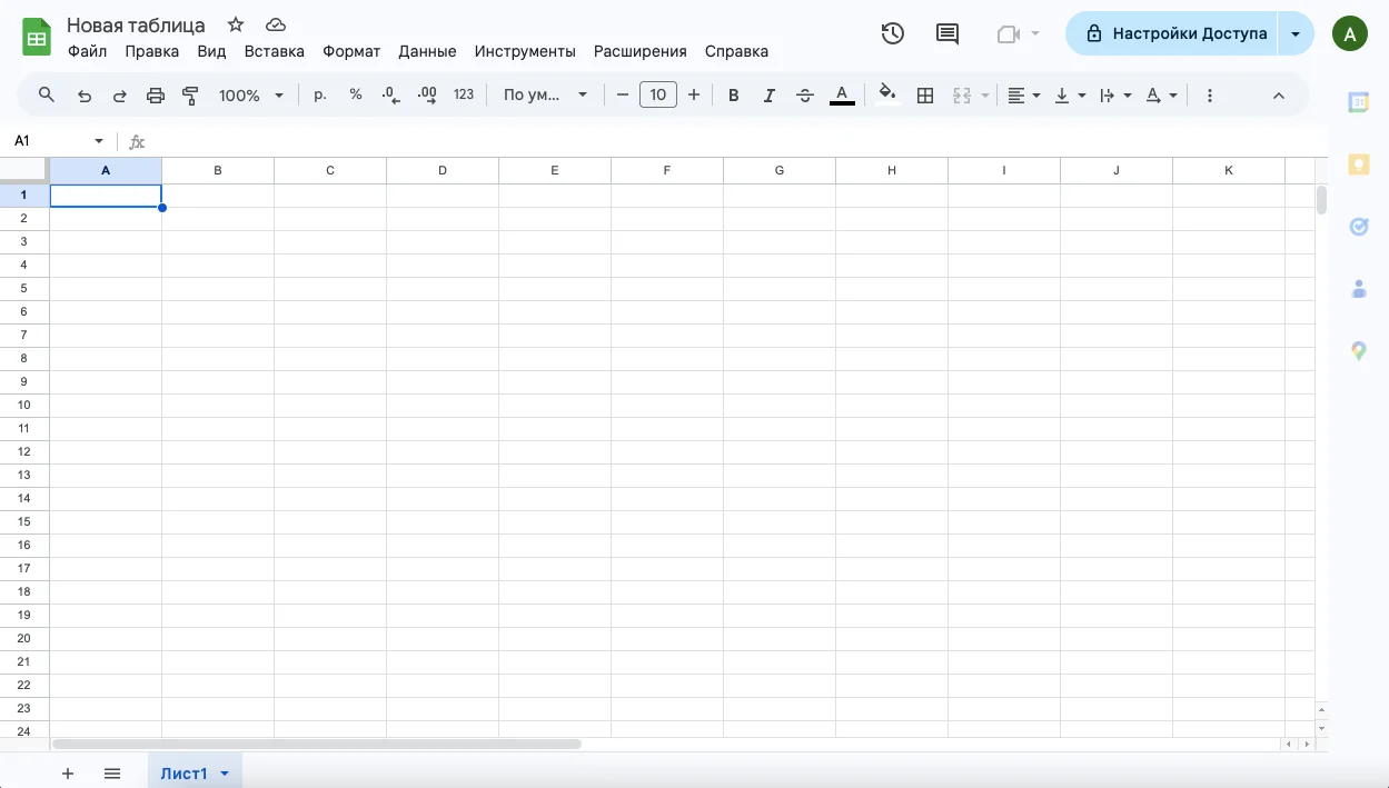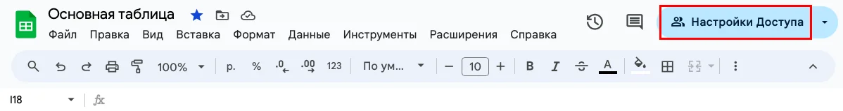 Чтобы работать над таблицей вместе с другими пользователями, нужно проверить «Настройки доступа». Эта кнопка находится в верхнем правом углу экрана.