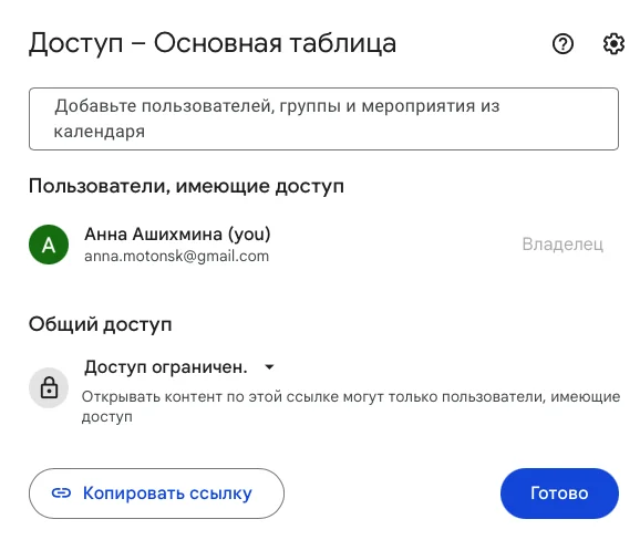Если нажать на кнопку, откроется окно с настройками. Здесь вы можете указать, кто именно получит доступ к вашей таблице или настроить «Общий доступ» для всех, кто получит ссылку на вашу таблицу.