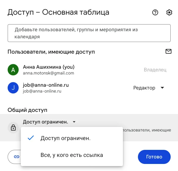 Если нужно дать доступ конкретным людям, вы можете указать их электронные адреса в поле в верхней части окошка.