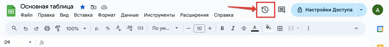 Если нужно вернуть изменения, сделанные давно, можно воспользоваться функцией «История версий». Нажмите кнопку с часиками в правом верхнем углу экрана, так откроется текущая версия таблицы.