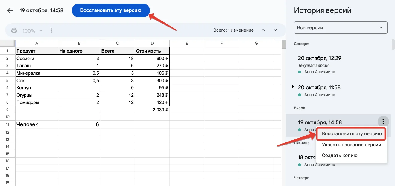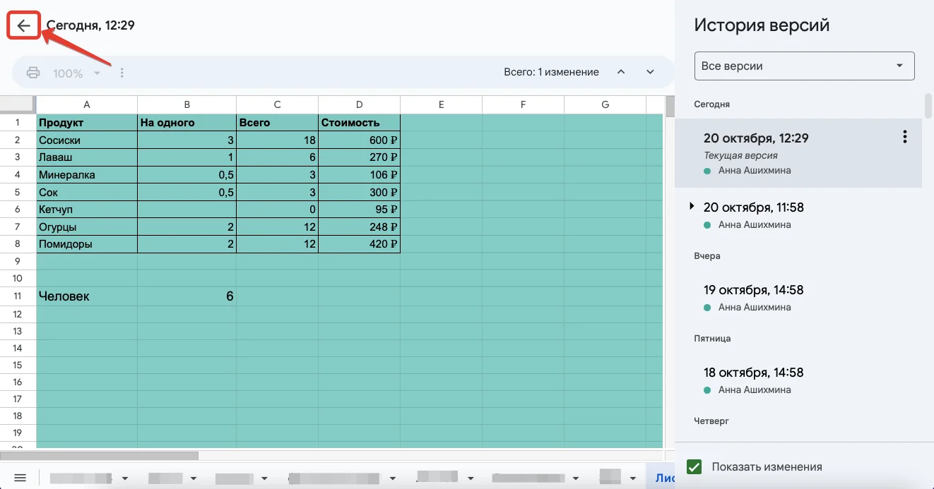 Зеленым цветом будут выделены изменения, которые появились с прошлого сохранения. В правой части экрана будет список предыдущих версий документа и авторы этих изменений. Нажимайте на них, чтобы увидеть предыдущие версии таблицы. Если нужно вернуться к текущей таблице, нажмите на стрелку в левой верхней части экрана.