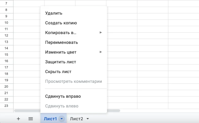 Если нажать на маленький треугольник рядом с названием листа, раскроется контекстное меню, в котором указаны конкретные действия. Это меню позволяет удалять или переименовать листы, копировать их, скрывать или выделять цветом.