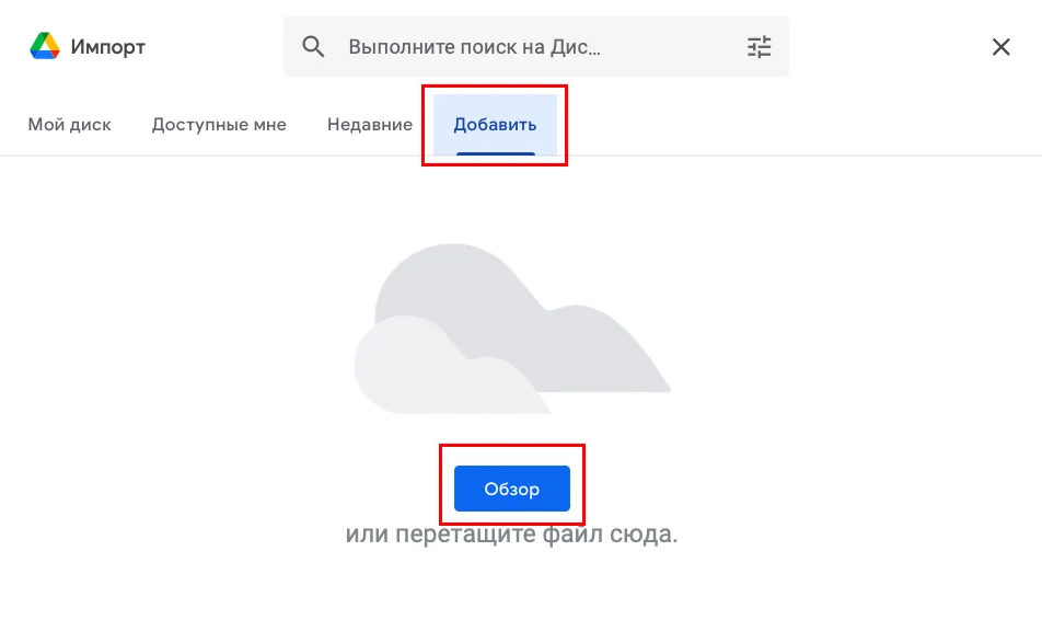 Также в Google Sheets можно открыть готовую таблицу, например из файла XLS или CSV. Для этого в главном меню выбираем: «Файл» — «Импортировать». В появившемся окошке переходим на вкладку «Добавить» и нажимаем кнопку «Обзор», после чего выбираем нужный файл на компьютере.