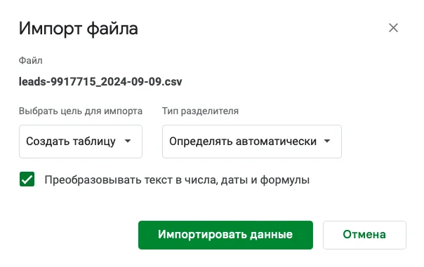 Затем появится окно «Импорт файла», в выпадающем списке «Выбрать цель для импорта» ставим: «Создать таблицу». Тип разделителя оставляем по умолчанию — «Определять автоматически» и нажимаем зелёную кнопку «Импортировать данные». Поздравляем — таблица импортирована в Google Sheets.