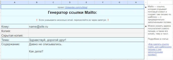 Google-таблица помогает сделать Mailto — специальную ссылку, которая открывает почтовый клиент и создает там письмо по шаблону. Можно предварительно заполнить поля — указать адреса получателей (самого письма, а также его копий), тему и текст.