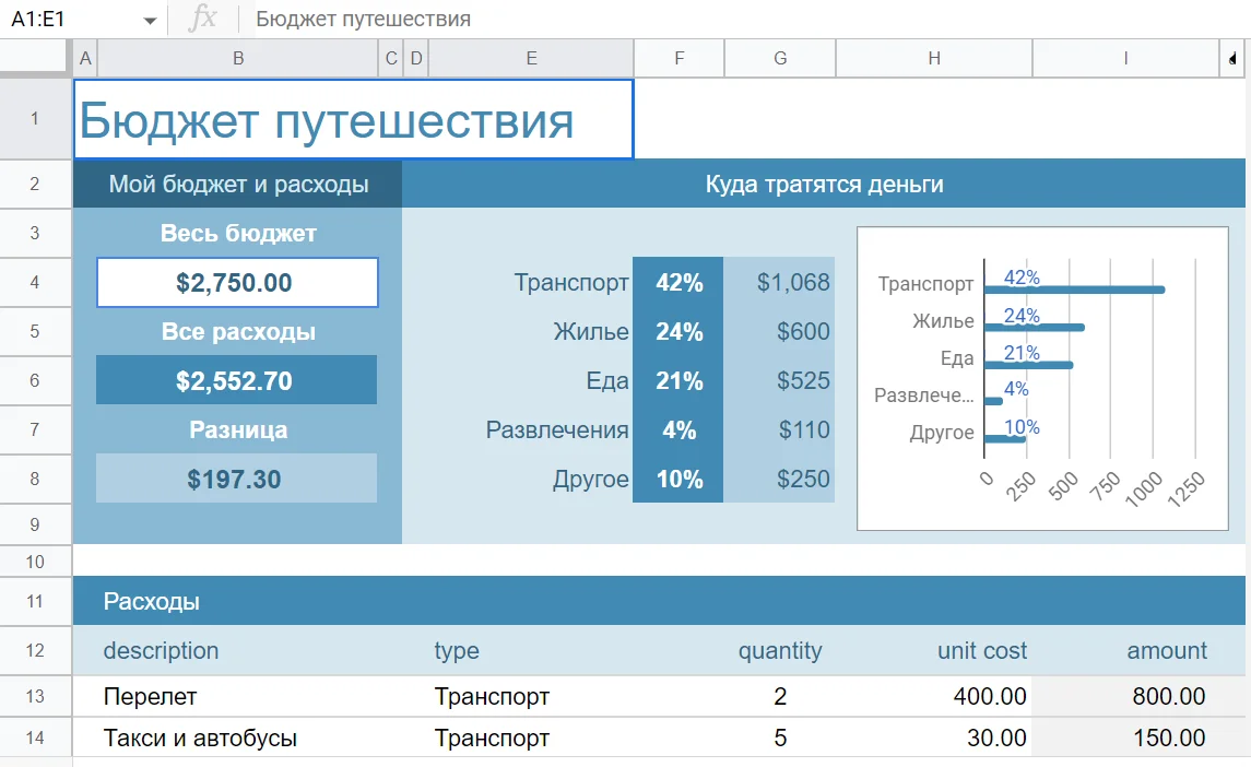 С этой таблицей вы можете рассчитать затраты на путешествие, учесть основные расходы и сравнить их с запланированным бюджетом. Визуализация данных в виде диаграммы помогает понять, какая статья расходов лидирует.