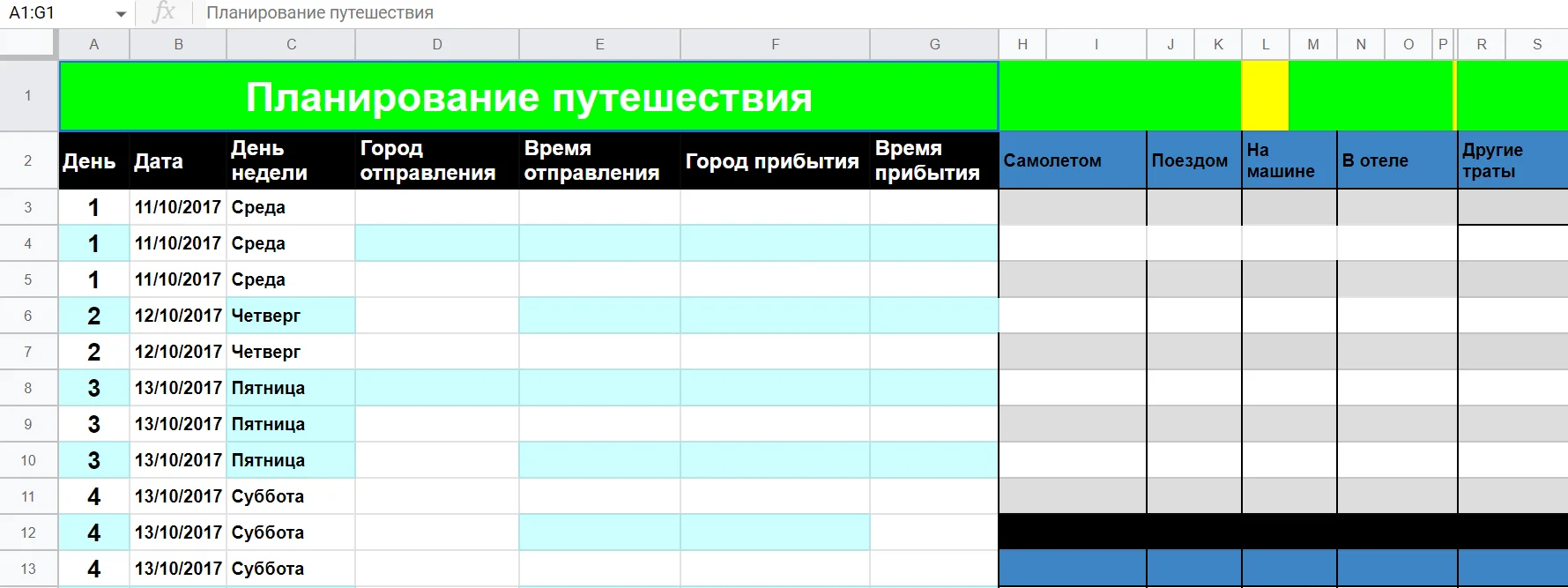 Таблица пригодится, чтобы составить расписание путешествия по нескольким местам. Можно указать города, время отправления и прибытия, отметить виды транспорта и подсчитать общие временные затраты.