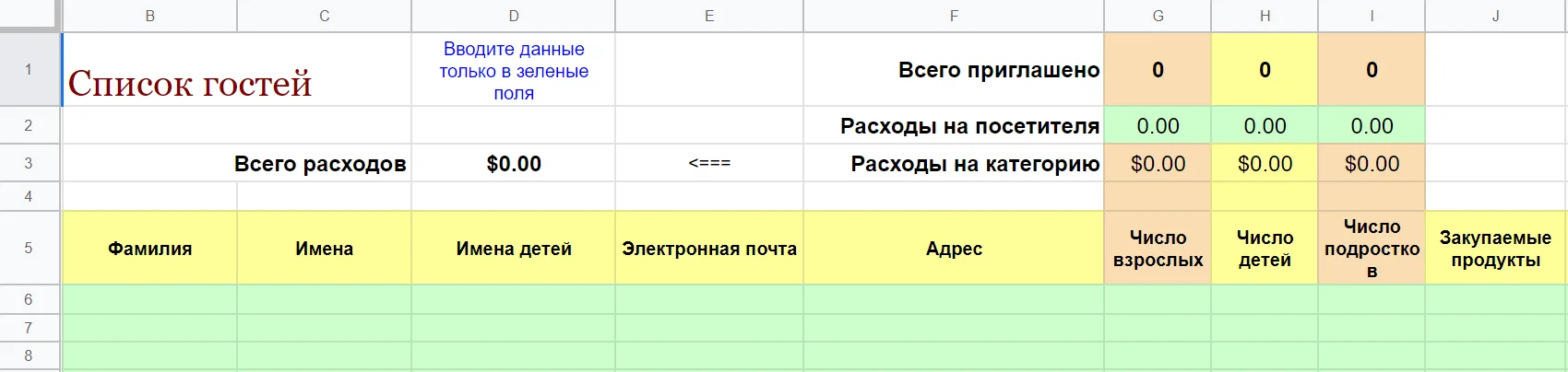 Столбик «Закупаемые продукты» и дополнительный лист «Список покупок» пригодятся, если вы планируете совместную организацию, и гости тоже участвуют в подготовке. Можно указать, кто какую сумму потратит и кто что должен купить.