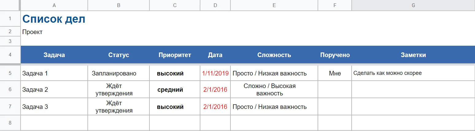 Альтернативой специализированным таск-менеджерам может стать эта таблица. Составьте список задач, укажите текущий статус, приоритет и дату исполнения. Дополнительно можно добавить поясняющие комментарии. Также здесь удобно указывать исполнителя при командной работе. Выполненные задачи можно просто удалять или менять их статус.