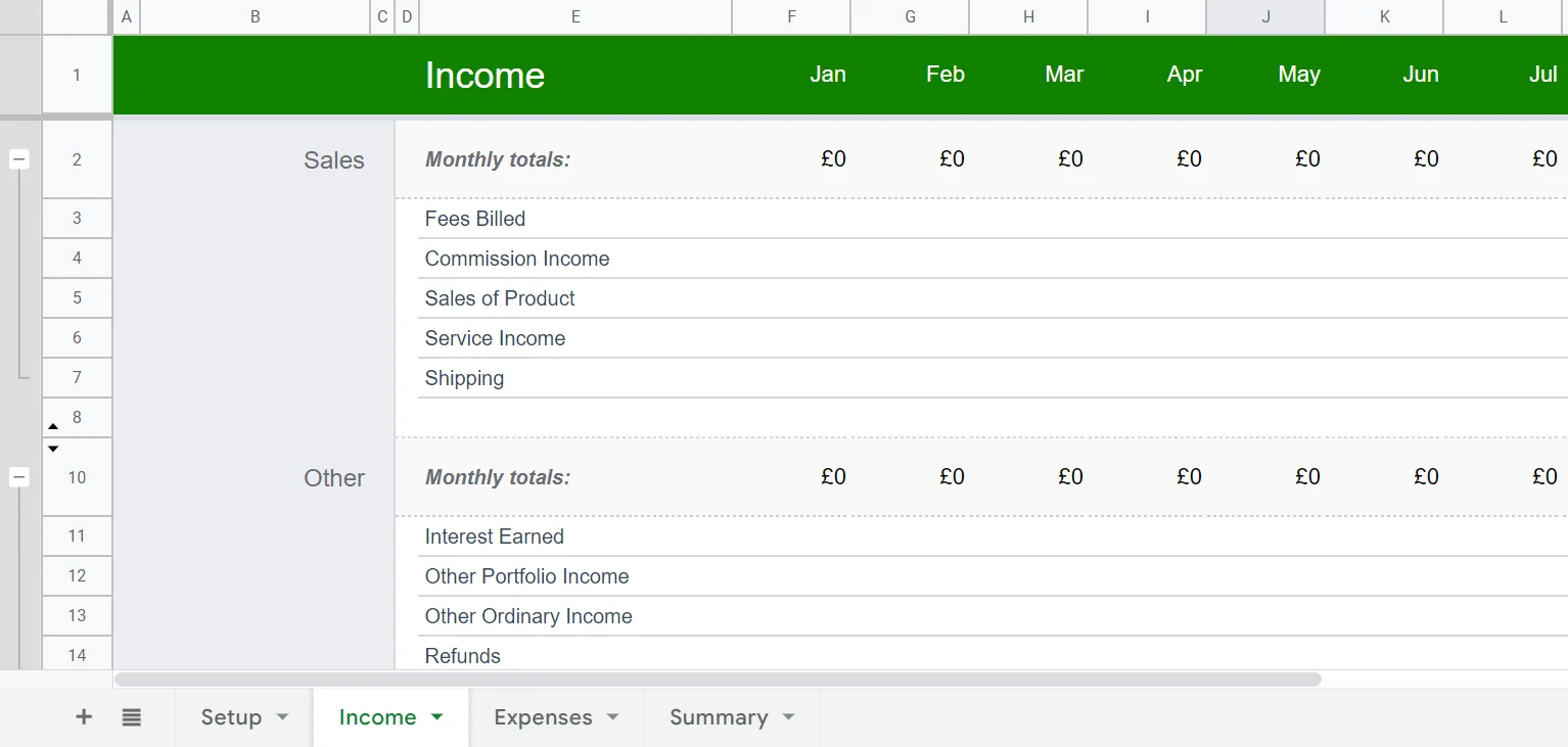 Шаблон включает несколько таблиц — настройка, доходы, расходы, сводка. Для каждого листа предусмотрено несколько категорий. Вы можете указать все планируемые поступления и затраты, а затем перейти к листу «Сводка» (Summary). Сервис посчитает разницу доходов и расходов и отобразит получившийся баланс. При редактировании исходных данных подсчёты автоматически изменятся.