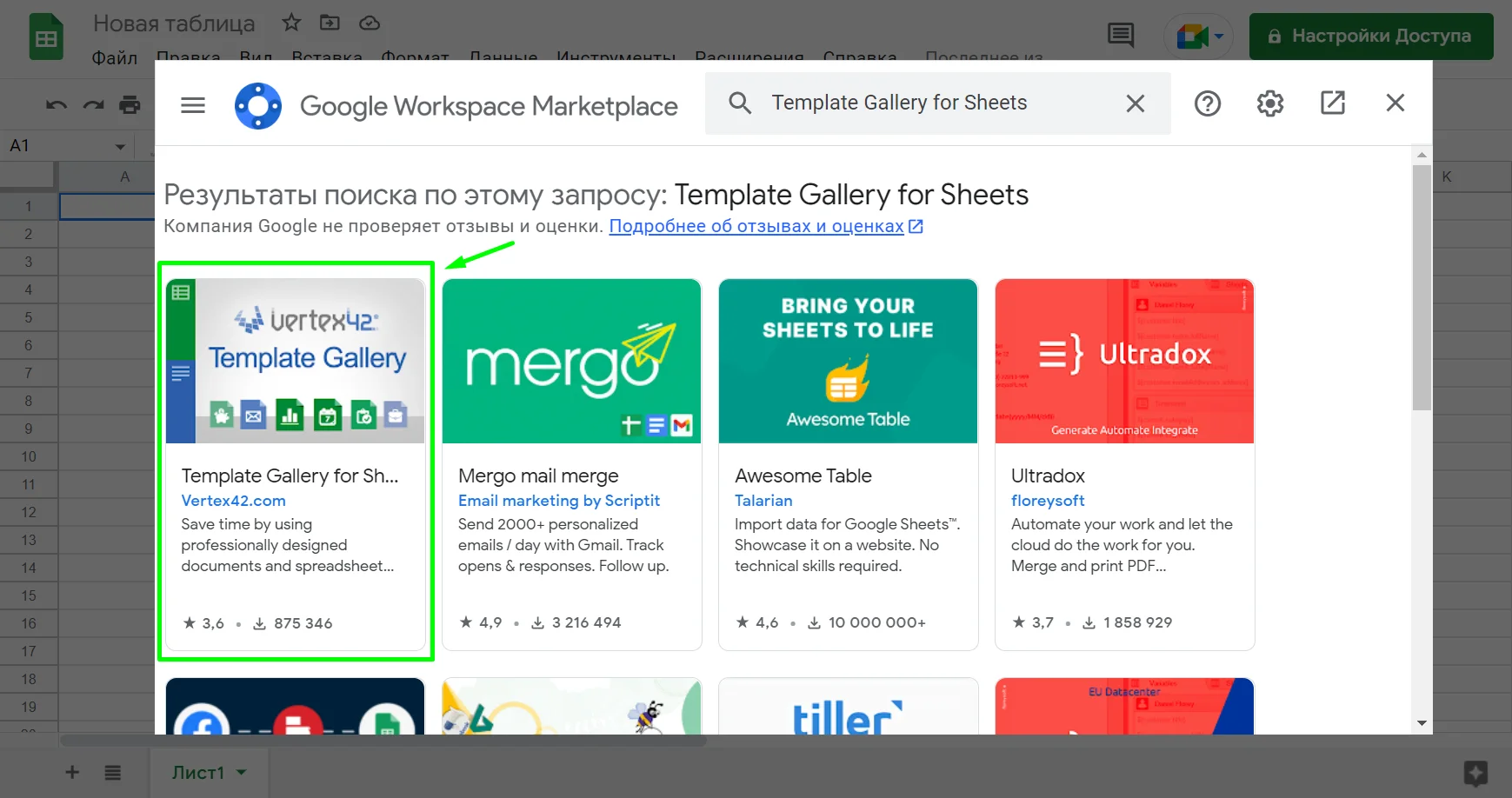 Ещё одним источником шаблонов может стать дополнение Template Gallery for Sheets. Его можно установить в качестве надстройки к Таблицам из Google Workspace Marketplace. Чтобы это сделать: