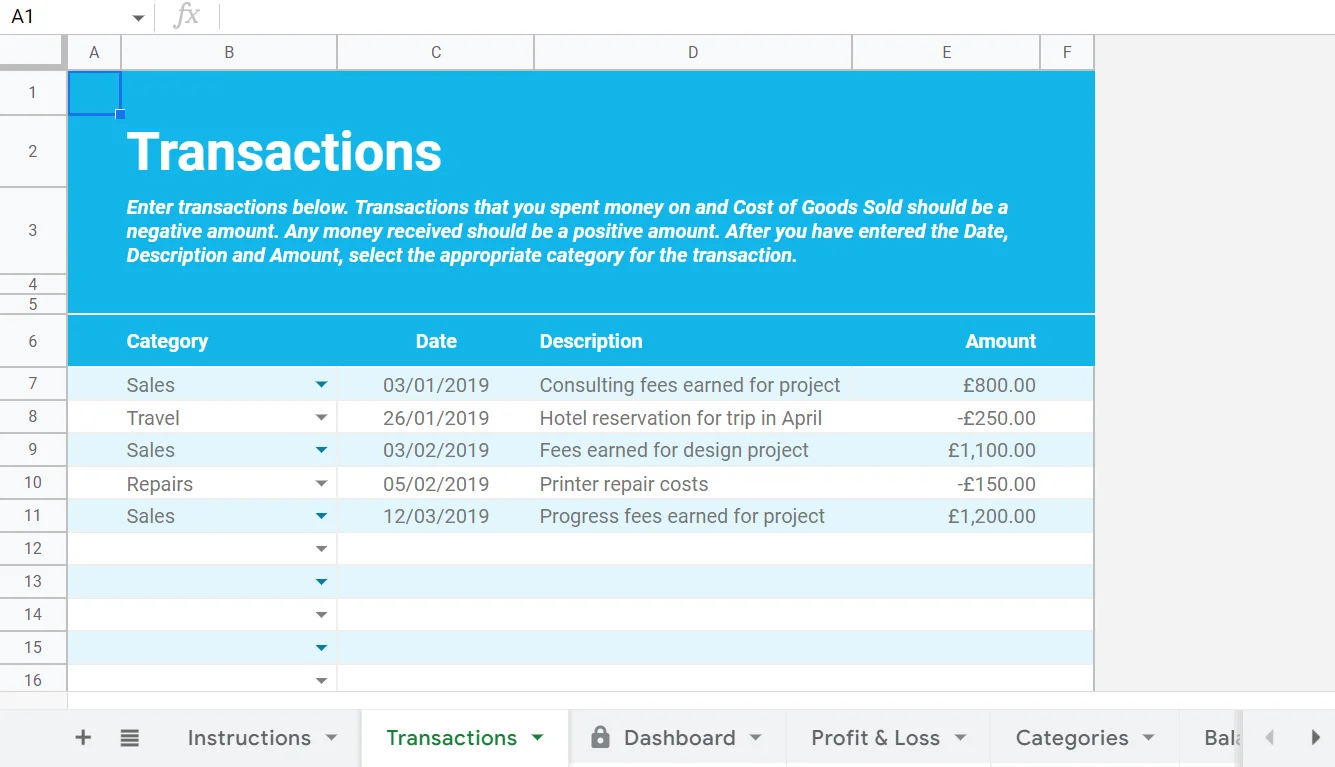 Ещё один объёмный шаблон, при помощи которого можно отслеживать прибыль и убытки. Во вкладке «Прибыли и убытки» (Profit@Loss) данные автоматически обрабатываются и отображается итоговый результат. Для небольшого бизнеса такая таблица может стать альтернативой бухгалтерским программам.