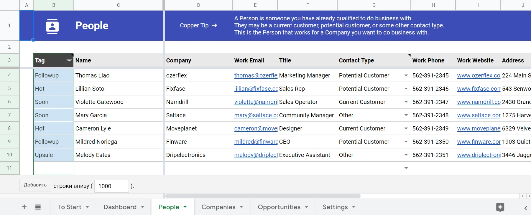 Для малого бизнеса аналогом профессиональной CRM может стать такой шаблон. Он объединяет несколько вкладок для учёта клиентов и продаж. Данные сохраняются автоматически. Можно открыть доступ всем ответственным сотрудникам. Дашборды генерируются автоматически и визуализируют данные.