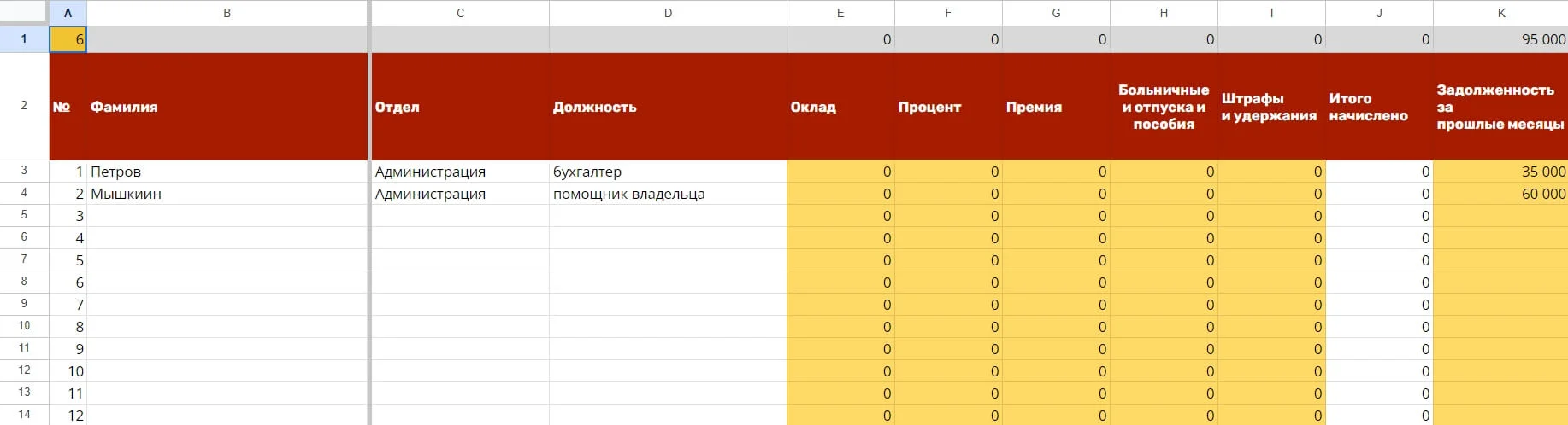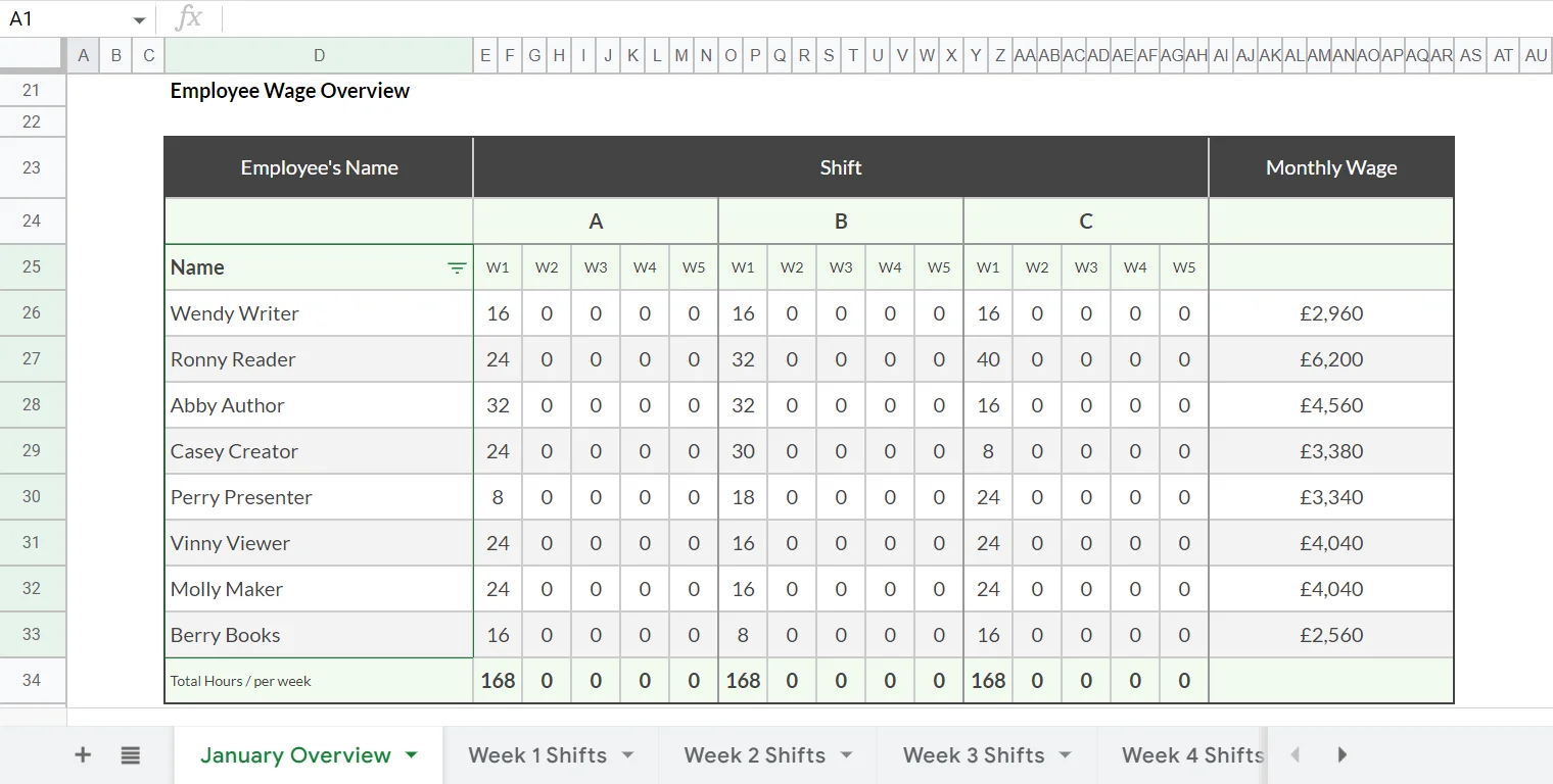 Когда рабочий график сотрудников не нормирован и люди получают оплату в зависимости от отработанных часов, сложно считать итоговую зарплату. Задача этой таблицы — упростить контроль графика работы и подсчёта выплат.