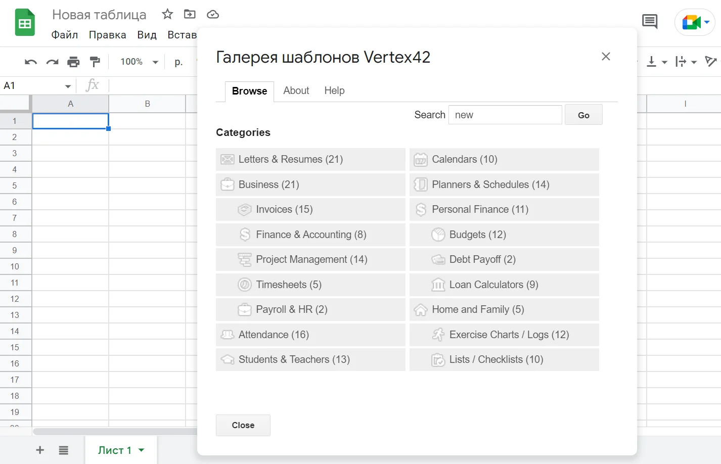 Чтобы использовать дополнение, перейдите по пути «Расширения → Template Gallery for Sheets → Browse Templates». Когда откроется всплывающее окно, вы увидите перечень из категорий таблиц. Здесь есть шаблоны для большинства популярных задач: письма и резюме, бизнес, календари, дом и семья, личные финансы и т.д.