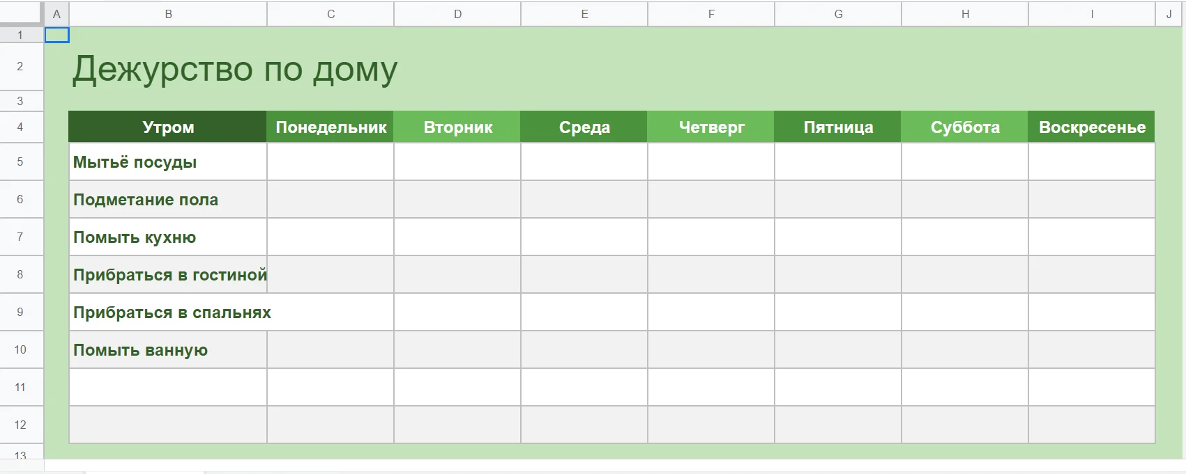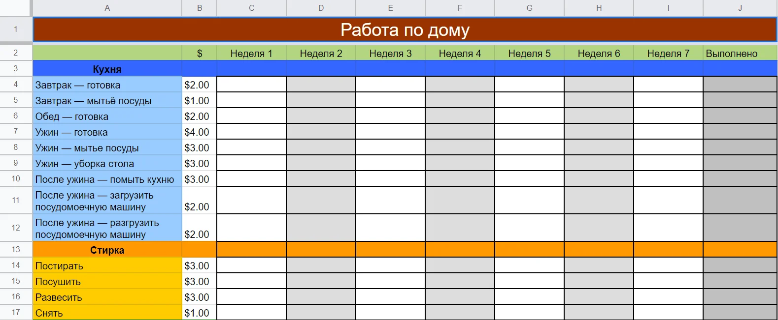 Таблица помогает распределить обязанности по дому между членами семьи. Здесь можно указать, кто, что и когда делает. Удобный инструмент для родителей, которые хотят приучить детей к домашним обязанностями и используют для этого какую-то мотивацию. В отдельном столбце можно указать размер вознаграждения за каждое дело и суммировать результаты по итогам недели.